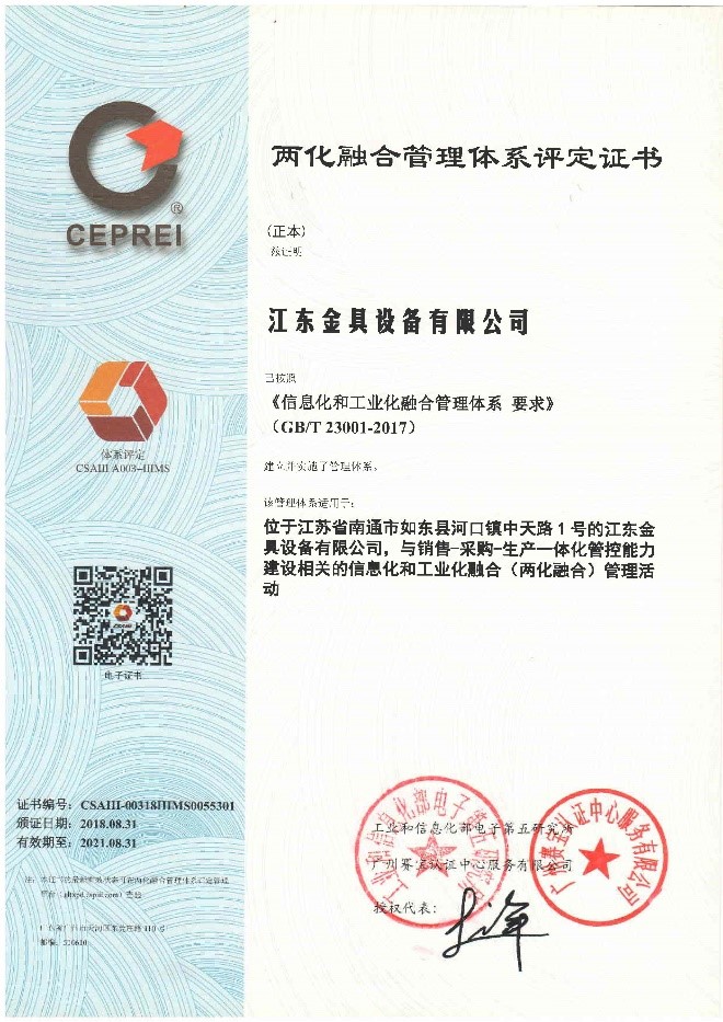 公司总经理薛渊牧作为江东金具两化融合最高管理者指出,公司将以本次两化融合管理体系贯标为新的起点,持续推进公司信息化和工业化深度融合,在打造“销售-采购-生产一体化管控能力”的基础上,逐步向“精益生产制造能力”、“业务财务一体化能力”等新型能力进行拓展,不仅要在行业内率先树立两化融合的样板,而且为“实现更有质量的增长”奠定基础。