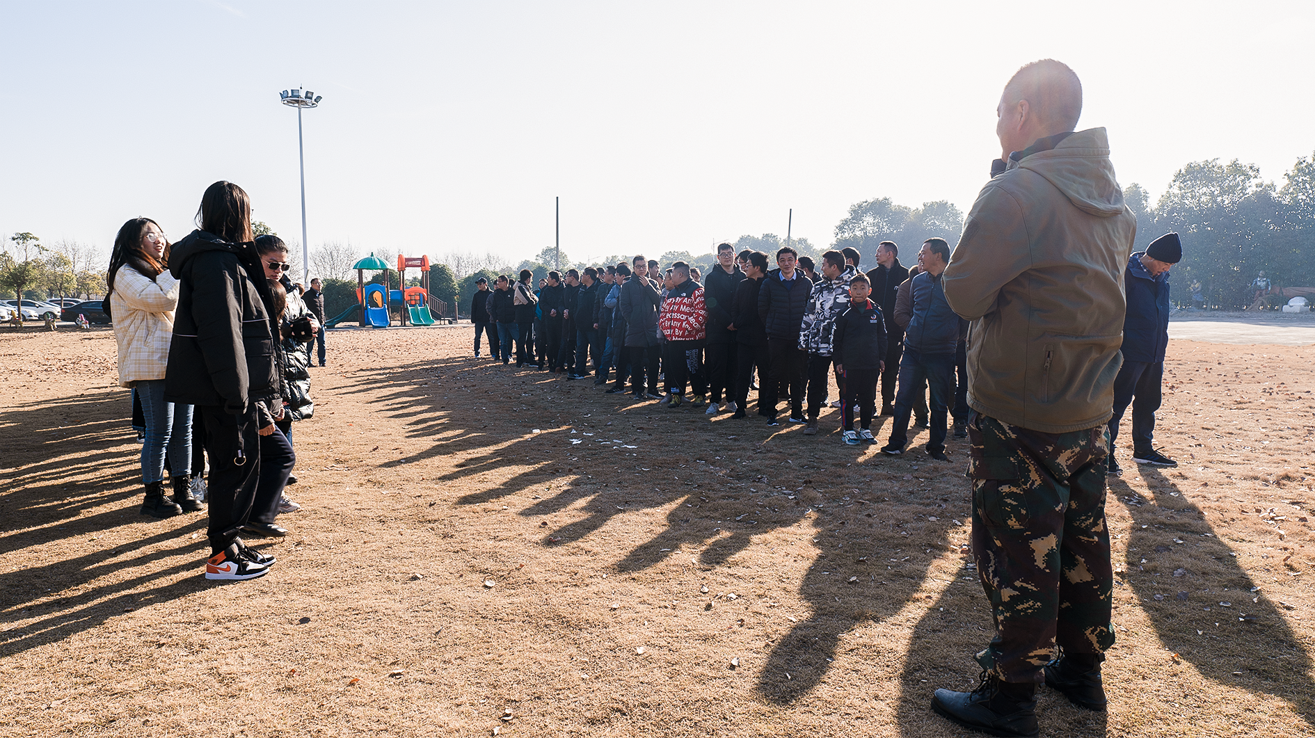 上午9:00开展拓展活动,教练把员工们分成四组开始热身活动。