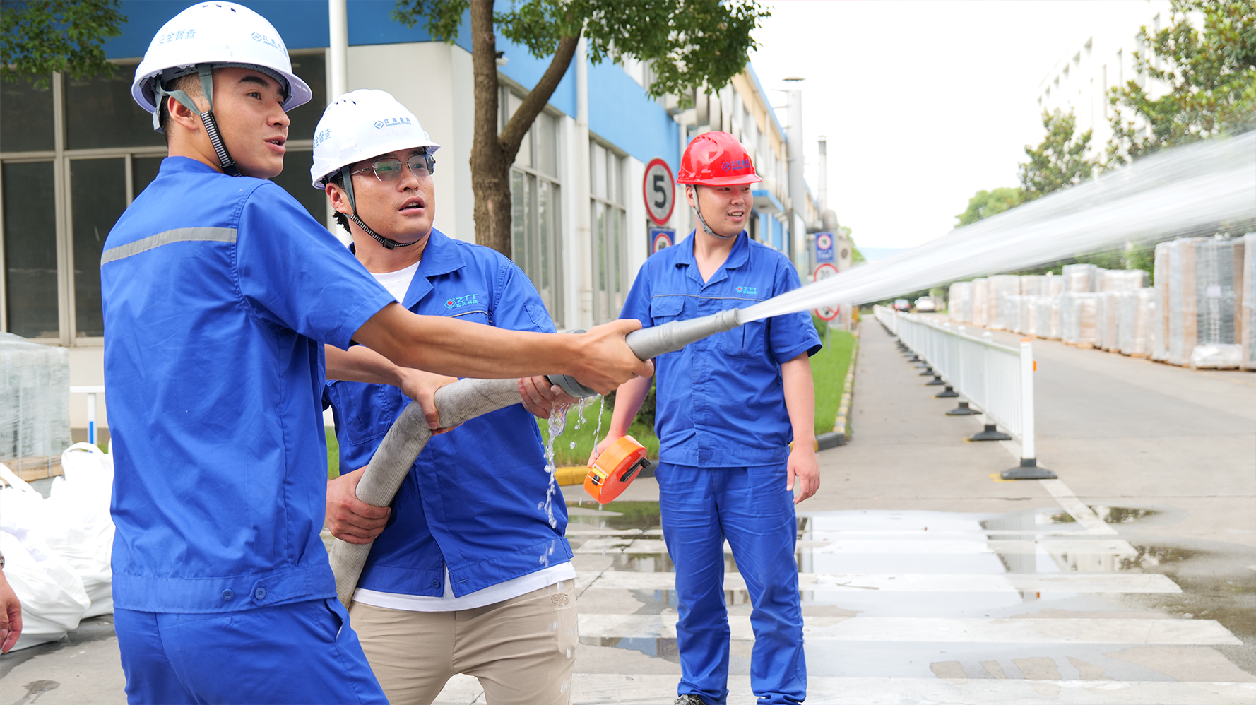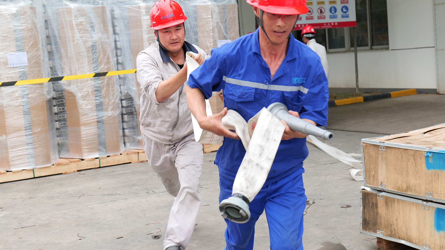 应急抢险组使用灭火器对火势进行压制,16时06分,应急抢险组使用消防水带对火势进行压制。